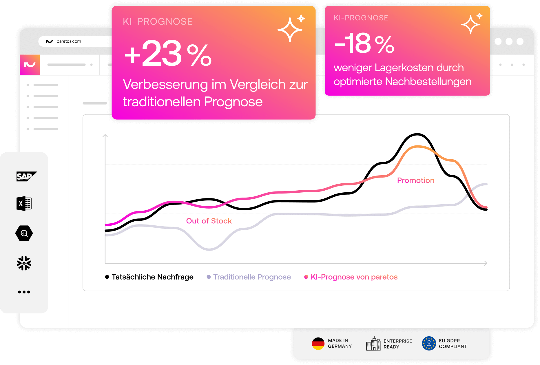 Von Absatzprognosen über Bestandsoptimierung zu Produktionsplanung – Welche Herausforderung wollen Sie als erstes angehen? paretos lässt sich optimal anpassen und bringt schnellen business impact. KI made in Germany!